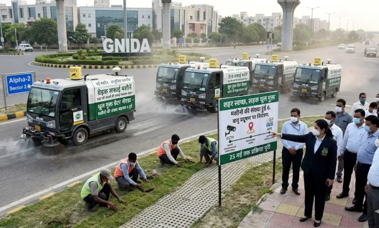 Greater Noida News, Clean City Campaign Noida, Dust Free Roads India, GNIDA Cleanliness Drive, Air Pollution Control Noida, Street Cleaning Machine, Urban Development UP, Greater Noida Update, Smart City Cleaning, Breaking News Noida, Environmental News India