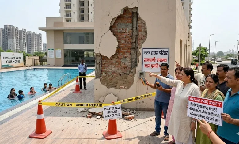 Greater Noida West की Himalaya Pride Society में एक बड़ा हादसा होते-होते टल गया, जब क्लब हाउस में स्विमिंग पूल के पास अचानक प्लास्टर गिर गया। गनीमत रही कि घटना के समय वहां मौजूद लोग बाल-बाल बच गए और कोई घायल नहीं हुआ।