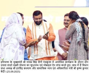 हरियाणा, पंचकूला सितंबर 25– हरियाणा सरकार ने अंत्योदय के प्रणेता पंडित दीनदयाल उपाध्याय की जयंती को विकास, अंत्योदय उत्थान और नारी शक्ति को समर्पित करते हुए कई महत्वाकांक्षी योजनाओं और परियोजनाओं की सौगात जनता को दी। इस अवसर पर वीरवार को जिला पंचकूला के ताऊ देवीलाल स्टेडियम में आयोजित राज्य स्तरीय समारोह के दौरान मुख्यमंत्री श्री नायब सिंह सैनी ने महिलाओं की आर्थिक व सामाजिक स्थिति को मजबूत बनाने के लिए ‘दीनदयाल लाडो लक्ष्मी योजना’ की शुरुआत की और योजना को सुचारू रूप से लागू करने के लिए विशेष मोबाइल ऐप भी लॉन्च किया।