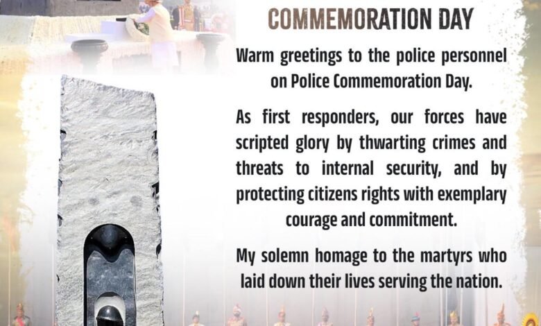 New Delhi (मिताली चंदोला, एडिटर, स्पेशल प्रोजेक्ट्स) : पुलिस स्मृति दिवस पर देश ने अपने पुलिस कर्मियों की बहादुरी, समर्पण और बलिदान को याद किया। प्रधानमंत्री श्री नरेंद्र मोदी, गृह मंत्री श्री अमित शाह और रक्षा मंत्री श्री राजनाथ सिंह ने इस अवसर पर पुलिस की महत्वपूर्ण भूमिका को सराहा, जो नागरिकों की सुरक्षा और आंतरिक सुरक्षा बनाए रखने में अहम योगदान देते हैं।