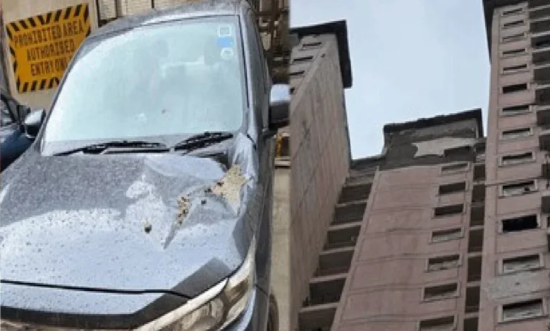 प्रत्यक्षदर्शियों के अनुसार, शाम के समय अचानक मौसम खराब हो गया और तेज हवाओं के साथ बारिश शुरू हो गई। इसी दौरान बिल्डिंग की बाहरी दीवार से प्लास्टर का बड़ा टुकड़ा टूटकर नीचे गिरा और सीधे पार्किंग में खड़ी कार पर आ गिरा। घटना के बाद सोसाइटी में अफरा-तफरी का माहौल बन गया।