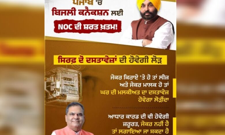 कैबिनेट मंत्री संजीव अरोड़ा ने जानकारी देते हुए बताया कि अब से किसी भी नए बिजली कनेक्शन के लिए ‘अनापत्ति प्रमाण पत्र’ (एनओसी) की आवश्यकता नहीं होगी। नए फैसले के अनुसार, ग्राहकों को बिजली कनेक्शन लेने के लिए केवल दो दस्तावेज़ जमा करने होंगे:1. रजिस्ट्री या लीज़ डीड 2. पहचान प्रमाण । कैबिनेट मंत्री संजीव अरोड़ा ने कहा कि यह कदम इसलिए उठाया गया है क्योंकि जब लोगों को कनेक्शन नहीं मिलता है, तो वे ‘कुंडी कनेक्शन’ लगवा लेते हैं। इससे जुर्माना इतना बढ़ जाता है कि लोग उसे चुकाते ही नहीं हैं, जिससे समस्या बढ़ जाती है। पर अब ऐसा नहीं होगा।