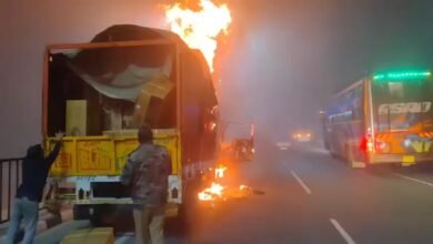 उत्तर प्रदेश : हापुड़ में एनएच-9 पर चलती कैंटर में लगी आग, चालक ने कूदकर बचाई जान