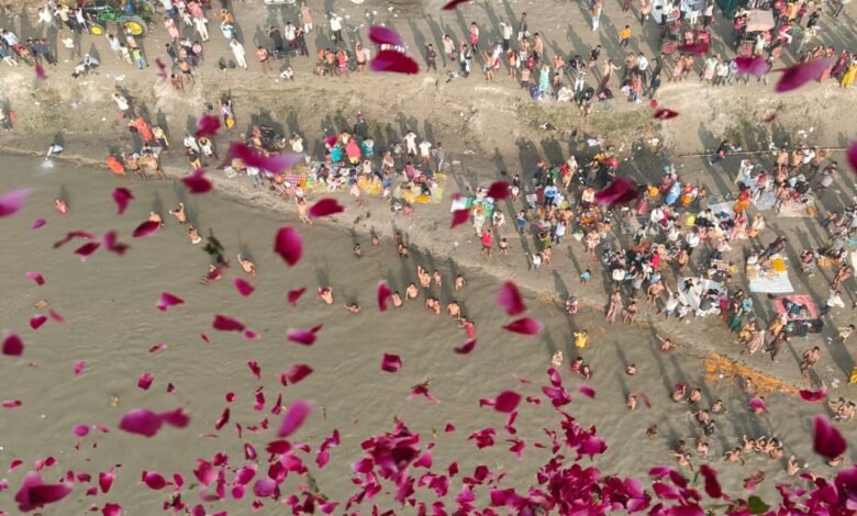 उत्तर प्रदेश : हापुड़ में कार्तिक पूर्णिमा मेले में गंगा स्नान करने आए श्रद्धालुओं पर हेलीकॉप्टर से हुई पुष्पवर्षा