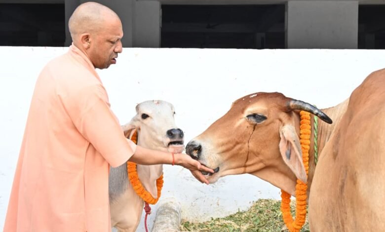 उत्तर प्रदेश : वैदिक मंत्रोच्चार के बीच गोपूजन के बाद सीएम ने गायों-गोवंश को खिलाया गुड़-केला