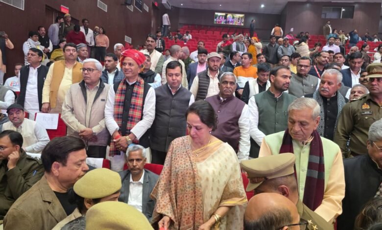 Mathura News : मथुरा में बॉलीवुड के ‘ही-मैन’ कहे जाने वाले दिवंगत अभिनेता धर्मेंद्र की आत्मा की शांति के लिए एक विशेष श्रद्धांजलि सभा का आयोजन किया गया। श्रीकृष्ण जन्माष्टमी आश्रम, छटीकरा रोड पर आयोजित इस सभा में उनकी पत्नी और मथुरा की सांसद हेमा मालिनी ने ब्रजवासियों के साथ मिलकर उन्हें भावभीनी श्रद्धांजलि अर्पित की।