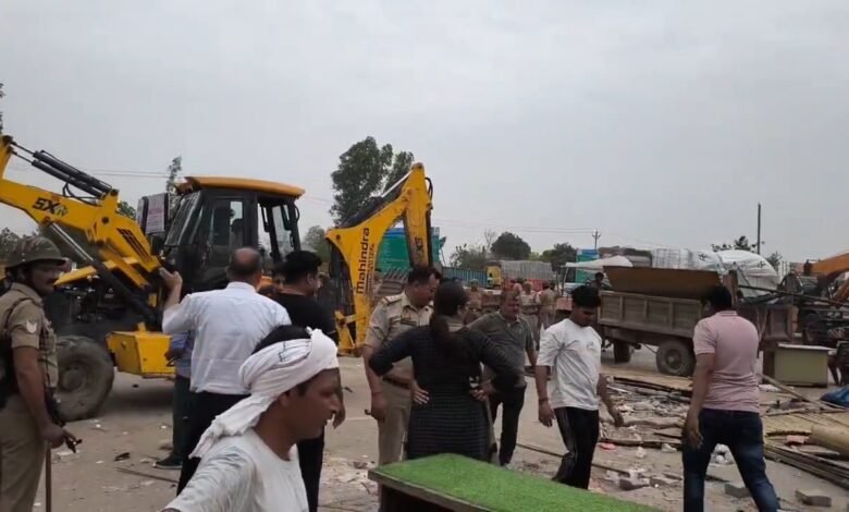 उत्तर प्रदेश : हापुड़ में अवैध निर्माण पर चला बुलडोजर, भाकियू कार्यकर्ताओं का धरना