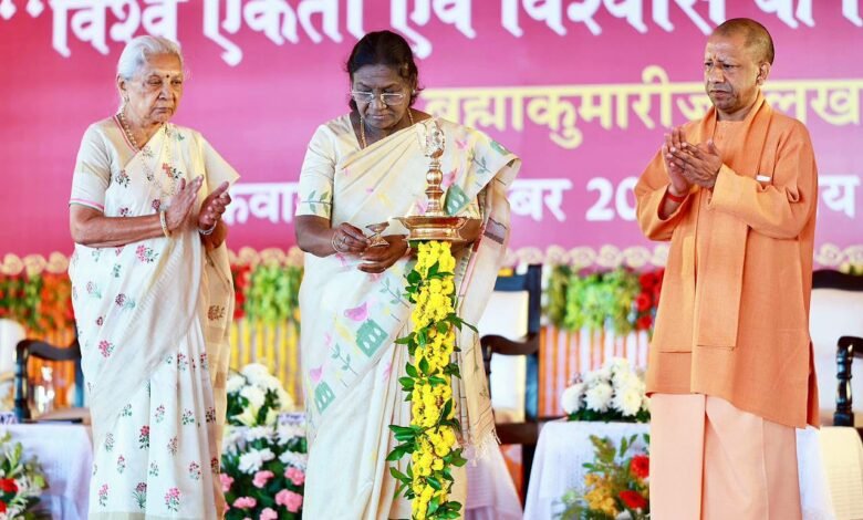 प्रजापिता ब्रह्माकुमारीज ईश्वरीय विश्वविद्यालय द्वारा लखनऊ में आयोजित विश्व एकता एवं विश्वास के लिए ध्यान (योग) के राज्य स्तरीय उद्घाटन समारोह का शुभारंभ राष्ट्रपति मुर्मु ने दीप प्रज्ज्वलन के साथ किया। उन्होंने ब्रह्मकुमारियों को कलश सौंपा तथा भ्राताओं को ब्रह्मकुमारीज की ध्वजा प्रदान की। कार्यक्रम में छात्राओं ने पारंपरिक नृत्य शैली में सांस्कृतिक प्रस्तुति भी दी। इस दौरान ब्रह्मकुमारी राधा जी ने ईश्वरीय परिवार की ओर से स्वागत वक्तव्य दिया। भ्राता नथमल जी ने वैश्विक एकता और विश्वास को बढ़ावा देने के लिए राजयोग को अपनाने तथा विकारों को दूर करने का आह्वान किया। कार्यक्रम में मुख्यमंत्री योगी आदित्यनाथ, अपर महासचिव ब्रह्मकुमारीज एवं अध्यक्ष (शिक्षा शाखा, माउंट आबू) राजयोगी डॉ. ब्रह्मकुमार मृत्युंजय, निदेशक उपक्षेत्र लखनऊ राजयोगिनी ब्रह्मकुमारी राधा जी, राष्ट्रीय संयोजक कटक (ओडिशा) राजयोगी ब्रह्मकुमार नथमल जी समेत प्रजापिता ब्रह्माकुमारीज ईश्वरीय विश्वविद्यालय के पदाधिकारी, प्रशिक्षक और साधक उपस्थित रहे।