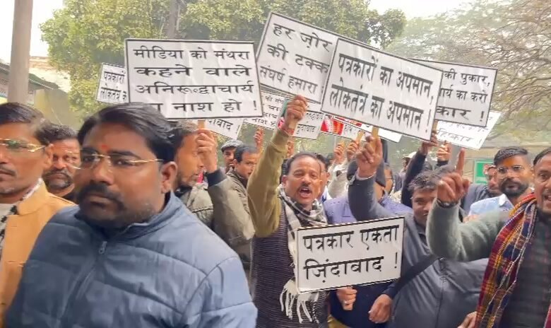 उत्तर प्रदेश : मथुरा में अनिरुद्धाचार्य के खिलाफ पत्रकारों का हल्लाबोल, सड़कों पर उतरकर की नारेबाजी