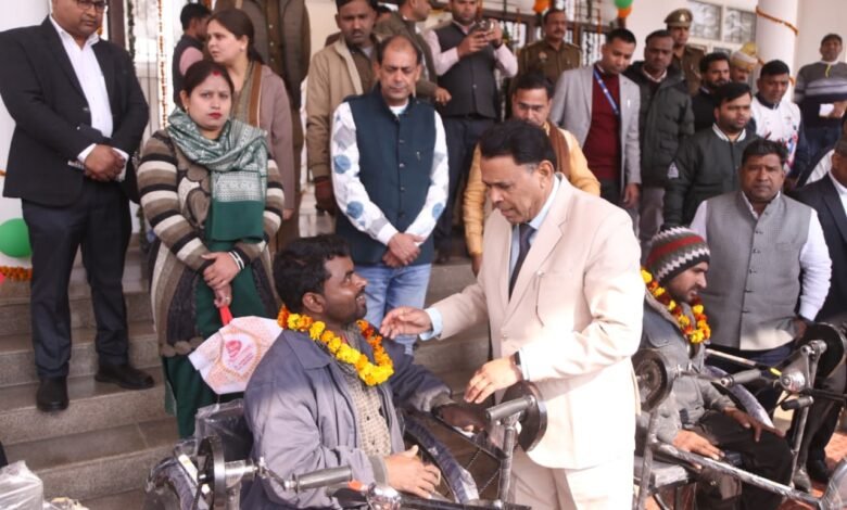 Hapur News : गणतंत्र दिवस के अवसर पर कलेक्ट्रेट सभागार में आयोजित कार्यक्रम में राज्यमंत्री पिछड़ा वर्ग एवं दिव्यांगजन सशक्तीकरण विभाग उत्तर प्रदेश सरकार नरेंद्र कश्यप द्वारा जनपद के दिव्यांगजनों को कृत्रिम अंग एवं सहायक उपकरण वितरित किए गए। इस अवसर पर योजना के अंतर्गत 72 दिव्यांगजनों को ट्राइसाइकिल, एडीएल किट, व्हीलचेयर, बैसाखी सहित अन्य सहायक उपकरण प्रदान कर लाभान्वित किया गया।