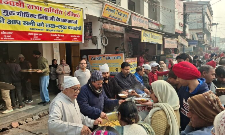 Hapur News : हापुड़ में गुरु गोविंद सिंह जी के प्रकाशपर्व के उपलक्ष्य पर नगर कीर्तन में पंजाबी सभा समिति द्वारा सेठ तुलाराम जी की धर्मशाला में प्रसाद वितरण किया गया। नगर कीर्तन में आए श्रद्धालुओं का पंजाबी सभा समिति द्वारा स्वागत किया गया।