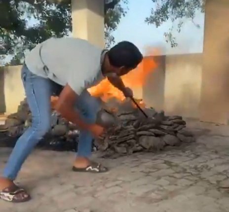 वायरल वीडियो में साफ दिखाई दे रहा है कि एक युवक हुक्का लेकर शमशान घाट पहुंचता है और जलती चिता से उपले निकालकर उसे हुक्के में भरता है, जबकि दूसरा युवक भी उसके साथ मौजूद रहता है। चिता की भस्म और उपलों का इस तरह इस्तेमाल धार्मिक भावनाओं को ठेस पहुंचाने वाला माना जा रहा है।